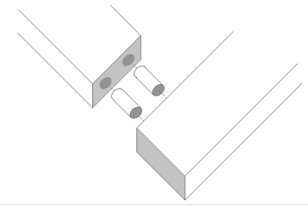 Dowel joint—this joint is at the end of a piece of wood that is butted up against another piece, and it is reinforced with dowel pins (there are holes drilled on each side of the joint for the dowel pins to be slid into). This joint is a very common joint when it comes to furniture that is made in a factory.