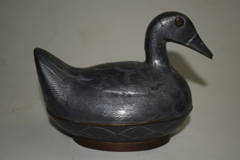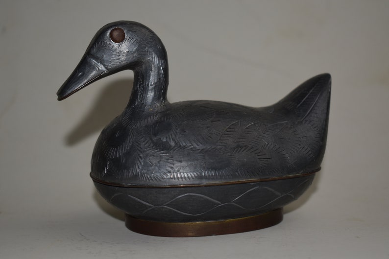 I quickly realized that it was a dresser box when I picked it up.  When I did, the duck also surprised me that it was made of pewter—I thought that it was pottery with a silver glaze.