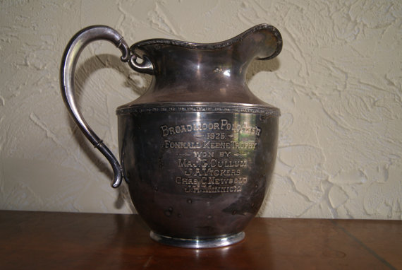 Several years ago, I happened across this wonderful trophy that is in the shape of a pitcher at a local flea market.  When I first saw it on the shelf, I didn’t see the engraving on the side of it.  When I read what it said, I got to wondering about who Foxhall Keene was and what exactly what the Broadmoor was as well.