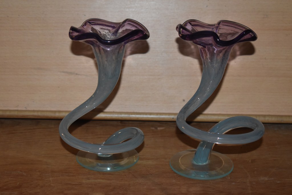 The most glaring thing about the two photographs is the background.  More importantly, the color of the background.  It makes the pair of Murano candleholders look completely different, almost like they are two completely different sets.